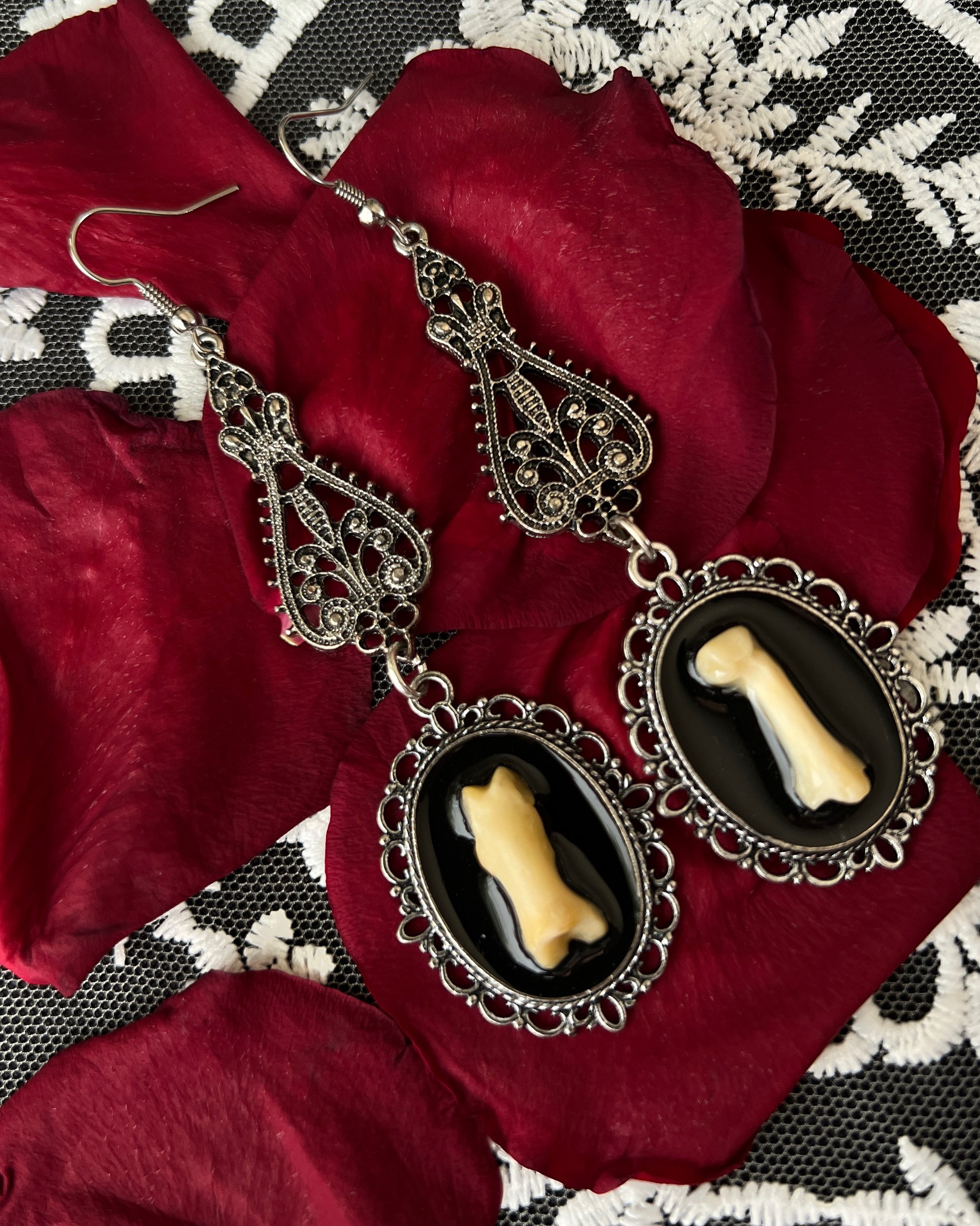 Ethically sourced badger toe bones adorn silver cameo settings. Adorned with silver filigree hardware.